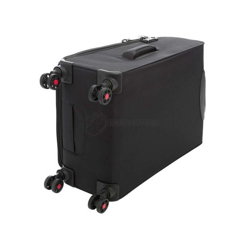 Средний чемодан оснащен четырьмя спаренными маневренными колесами. Для удобства перемещения есть удобная телескопическая ручка, подъемные боковая и сверху.