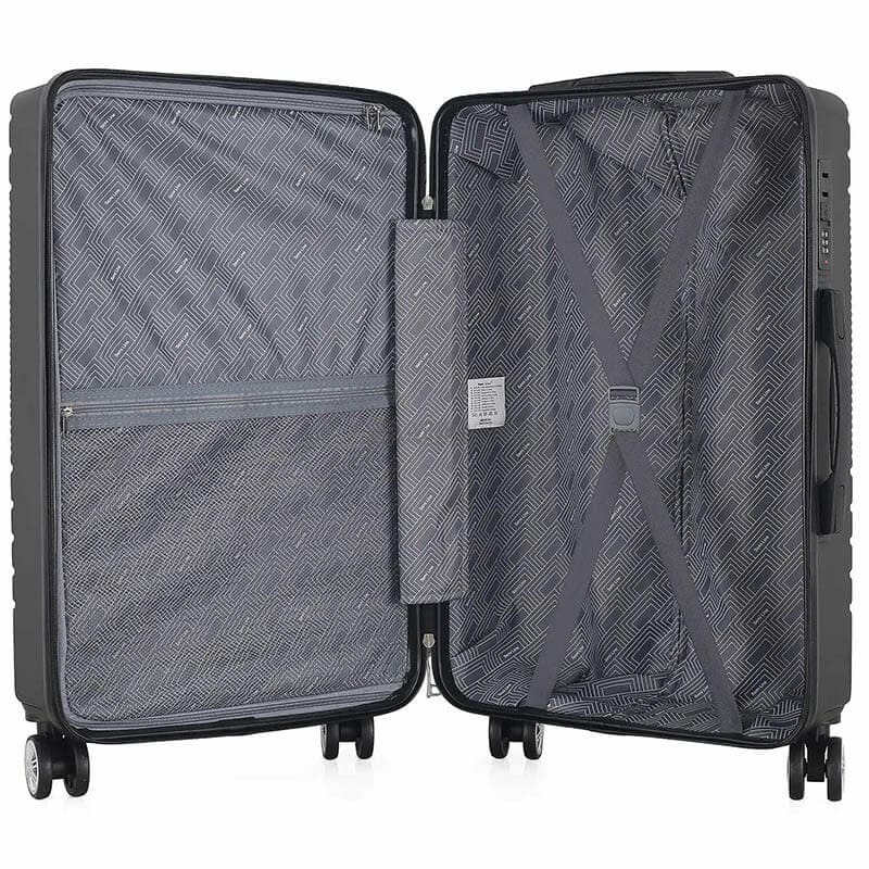 Чемодан имеет текстильную перегородку на молнии, которая разделяет внутреннее пространство на два основных отделения. Перегородка оснащена карманом на молнии для мелких вещей и документов.
