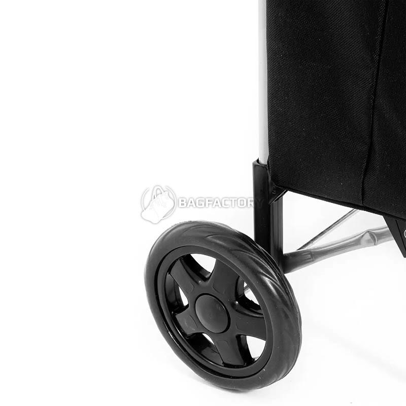 Съемные колеса оснащены кнопкой, при нажатии которой можно отсоединить колеса. Колеса имеют обод из пеносэвилена – легкого полимерного материала, сочетающего упругость и стойкость к истиранию, обеспечивая более плавное движение тележки по неровностям.