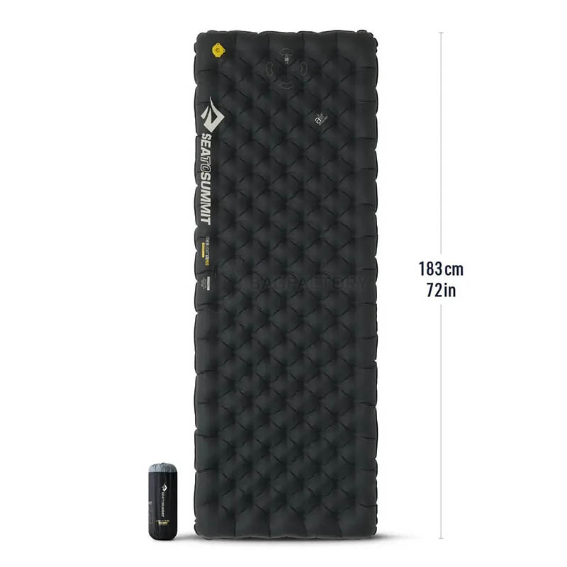 Коврик надувной Sea to Summit Ether Light XR Pro Insulated ASC Mat Regular Rectangular Wide. Габаритные размеры: 183х64х10 см. Размеры в сложенном состоянии: 24x13.5x13.5 см. Вес: 720 г. Вес мешка: 60 г. R-Value: 7.4. Материал: 30/40D nylon с TPU ламинацией, многослойный TRM отражающий утеплитель.