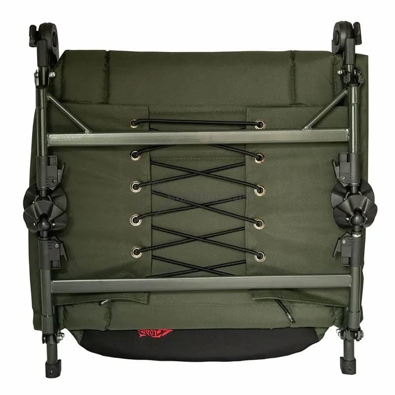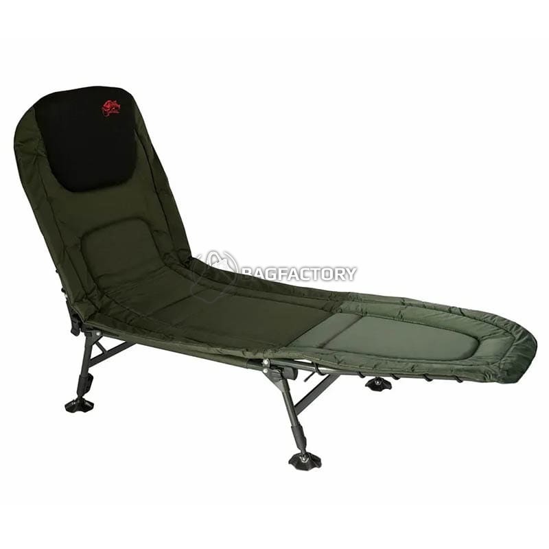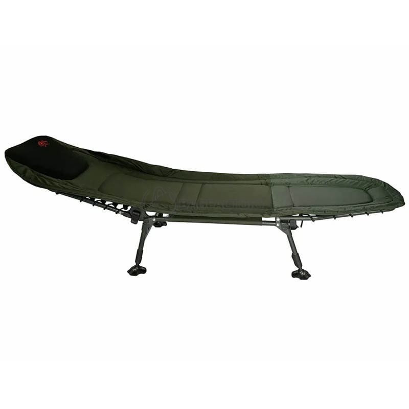 Простая в использовании и очень надежная (благодаря стальному каркасу) карповая раскладушка, способная выдержать нагрузку до 150 кг. Благодаря регулируемому наклону спинки модель может использоваться и как карповая кровать, и как рыболовное кресло одновременно. Ножки кровати легко складываются и регулируются на необходимую высоту, имеют хорошую устойчивость на любой поверхности. Матрас выполнен из устойчивого к влаге и грязи прочного многослойного полиэстера с PVC покрытием.